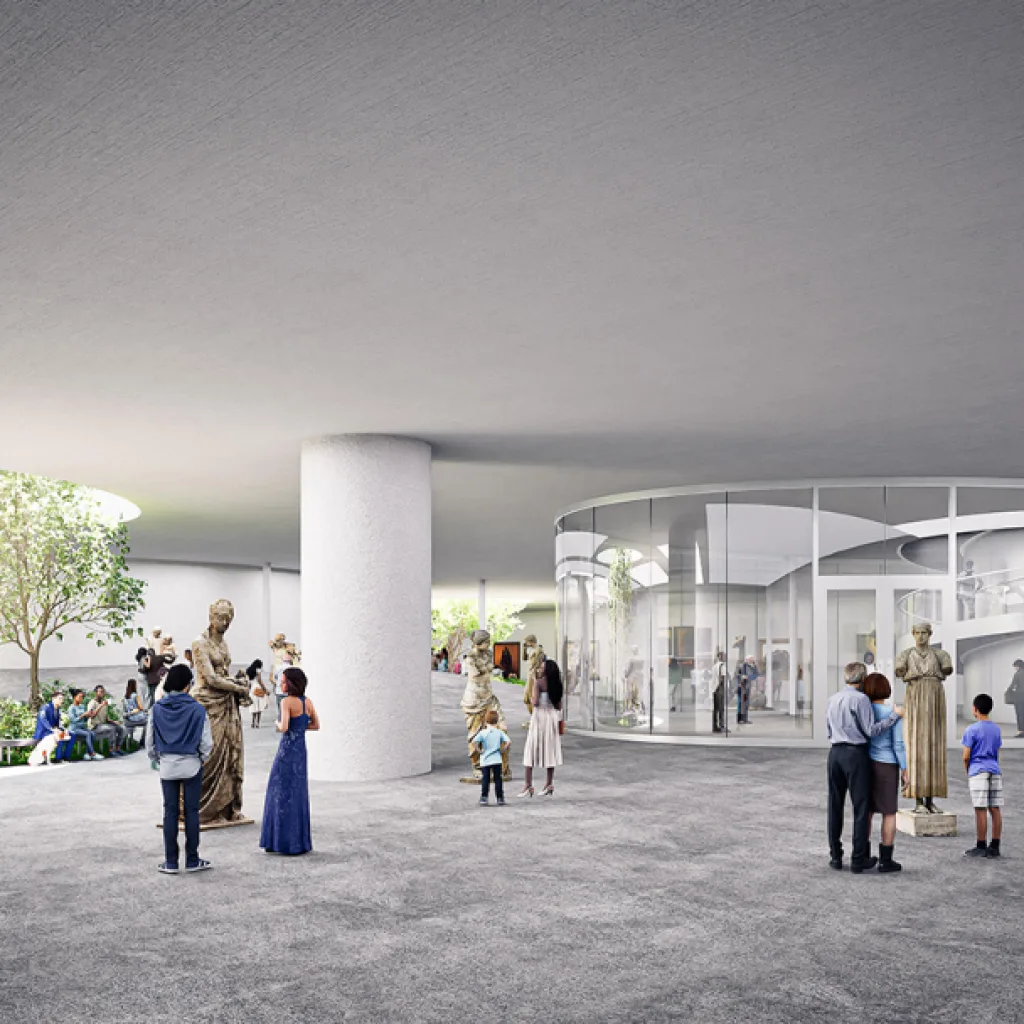A defining architectural element is the extension of the existing curved roof into a continuous canopy along the waterfront edge. This canopy structures circulation, provides shaded outdoor areas, and establishes a transition between urban pathways and harbor activity. Beneath the extended roof, a series of semi-open public spaces and a sheltered courtyard are introduced, allowing access from both the city promenade and the water. The museum is positioned as a connective public environment rather than a destination separated from its surroundings. Public accessibility is treated as a central design parameter throughout the project. The courtyard remains accessible beyond museum operating hours, enabling the site to function as an open civic space. Thresholds between interior and exterior areas are defined through spatial continuity rather than visual transparency alone. Exhibition halls, performance spaces, and public circulation zones are arranged to accommodate both curated cultural programs and informal daily use, allowing cultural activity to intersect with the rhythms of the city.